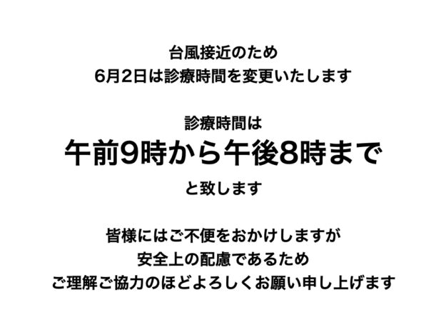 6月2日台風接近に伴う診療時間変更について 所長ブログBy 原純2023年6月1日コメントする診療所をご利用の皆様にご案内です。 現在台風が奄美に接近中です。直前まで台風の進路や通過する時期を見定めておりましたが、どうやら6月2日早朝が最も風雨が強くなりそうです。そのため、6月2日は安全上の配慮から診療時間を変更…