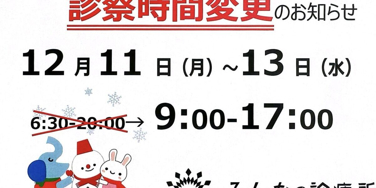 12月11日から13日も 9時 〜 17時 の診療時間とさせて頂きます。