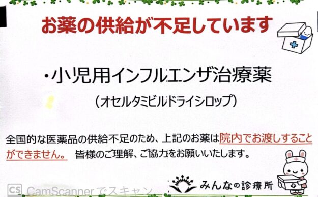 処方薬在庫切れのご案内 所長ブログBy 原純2024年2月13日コメントする連休中に院内の在庫を使い果たしてしまいました。次の入荷の目処が立たないためしばらく、オセルタミビルドライシロップについては処方する事ができません。ご不便をおかけしますが、何卒よろしくお願い申し上げます。