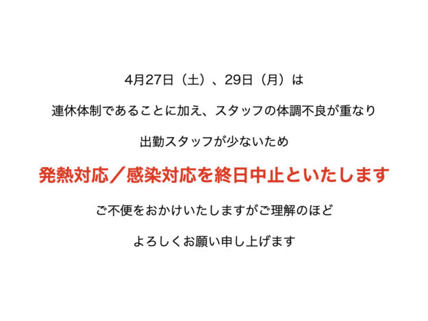 4月27日(土)、29日(日)の診療体制について 所長ブログBy 原純2024年4月26日コメントする4月27日(土)、29日(月)は連休体制であることに加え、スタッフの体調不良が重なり出勤スタッフが少ないため 発熱対応/感染対応を終日中止といたします ご不便をおかけいたしますがご理解のほど、よろしくお願い申し上げます