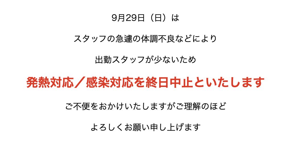 9月29日(日)はスタッフの急遽の体調不良などにより出勤スタッフが少ないため発熱対応/感染対応を終日中止といたしますご不便をおかけいたしますがご理解のほどよろしくお願い申し上げます カテゴリー: 所長ブログBy 原純2024年9月28日コメントする この投稿を共有する Facebook で共有Facebook で共有 ツイートTwitter で共有 投稿ナビゲーション前へ前の投稿:事務主任募集のお知らせ次次の投稿:休日や連休期間における診療体制について関連記事診療時間変更及び臨時休診のご案内2026年2月25日1分動画で振り返り2025年2025年12月31日2025年の診療面を振り返る2025年12月30日小徳とのこの1年を振り返る2025年12月29日繋がるご縁に感謝2025年12月11日診療所の新たな一歩2025年12月7日