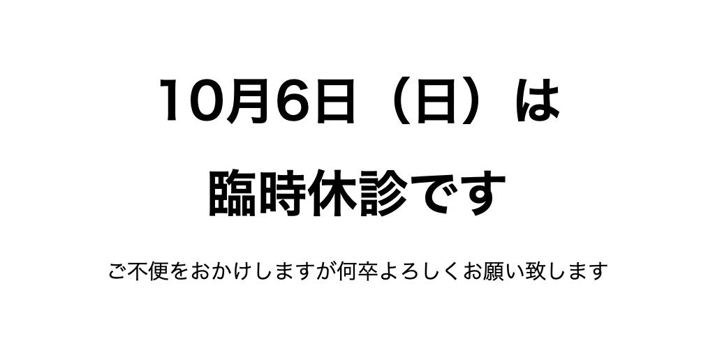 みんなの診療所をご利用の皆様にご案内です。10月6日(日)は臨時休診となります。ご不便をおかけいたしますが何卒よろしくお願い申し上げます。 カテゴリー: 未分類By 原純2024年10月5日コメントする この投稿を共有する Facebook で共有Facebook で共有 ツイートTwitter で共有 投稿ナビゲーション前へ前の投稿:休日や連休期間における診療体制について次次の投稿:2024年10月12日〜14日連休の報告関連記事3月の小徳の診療予定2026年2月26日2026年:みんなの診療所の羅針盤2026年1月1日年末年始診療のご案内2025年12月24日~自分よ!!もっと胸を張れ!!~Amami Centered Care<歩んできた道を振り返る:前編~今の私を形作ってくれた人たち>2025年10月23日いいいじゅー!!放送後の想い【15日13時からもNHKBSで放送あります】2025年9月14日2025/2026シーズンインフルエンザ予防接種のご案内2025年9月5日