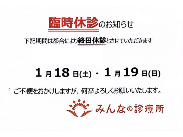 診療所をご利用の方にご案内です。 1月18日(土)、19日(日)は原が出張のため臨時休診です。皆様にはご不便をおかけしますが、何卒よろしくお願い申し上げます。