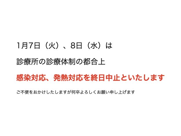 1月7日(火)、8日(水)は診療所の診療体制の都合上、感染対応、発熱対応を終日中止といたしますご不便をおかけしたしますが何卒よろしくお願い申し上げます