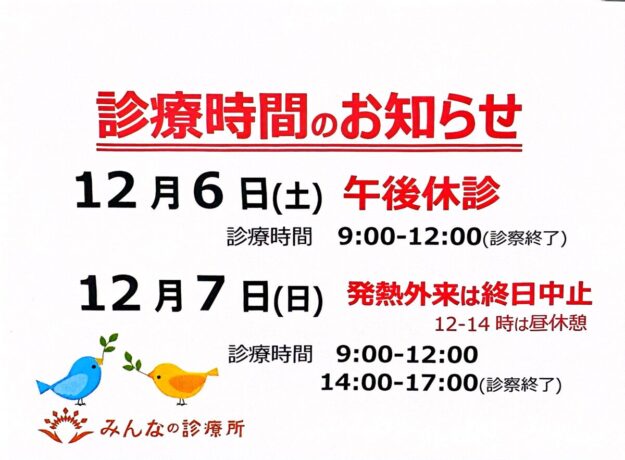 診療時間変更のご案内 所長ブログBy 原純2025年12月6日コメントする本日、12月6日は午前のみの診療となります。診療は12時までとなります。受付状況次第では早めに受付終了となる可能性があります。ご了承下さい。 また、7日は発熱外来は終日中止となります。また、12時から14時は一時診療を中…