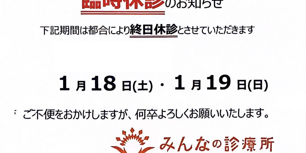 診療所をご利用の方にご案内です。 1月18日(土)、19日(日)は原が出張のため臨時休診です。皆様にはご不便をおかけしますが、何卒よろしくお願い申し上げます。 カテゴリー: 所長ブログBy 原純2025年1月17日コメントする この投稿を共有する Facebook で共有Facebook で共有 ツイートTwitter で共有 投稿ナビゲーション前へ前の投稿:1月20日以降の診療体制について次次の投稿:第1回日本劇的救命研究会関連記事1分動画で振り返り2025年2025年12月31日2025年の診療面を振り返る2025年12月30日小徳とのこの1年を振り返る2025年12月29日繋がるご縁に感謝2025年12月11日診療所の新たな一歩2025年12月7日診療時間変更のご案内2025年12月6日