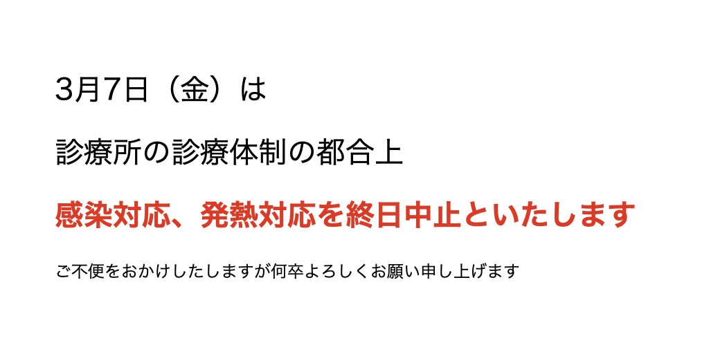 診療所スタッフも風邪や胃腸炎による体調不良者が増加しており、診療所の診療体制の都合上、3月7日(金)は終日発熱対応、感染対応を中止とさせて頂きます。皆様にはご不便をおかけしたしますが、何卒よろしくお願い申しあげます。