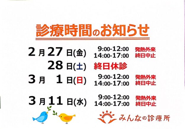 みんなの診療所をご利用の皆様にご案内です。この春は原の長男、次男がそれぞれ高校、小学校を卒業します。原は卒業式に参加のためお休みを頂くことにしました。今年は小徳がいてくれるため、極力診療に穴をあけずに原が診療をお休みする…