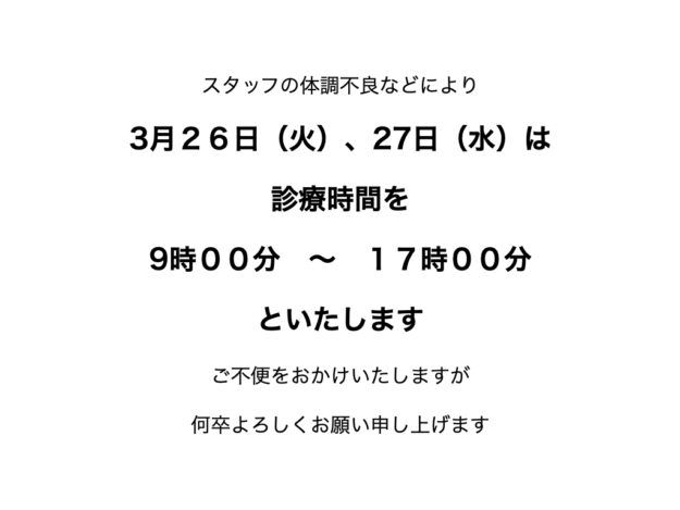 スタッフの体調不良などにより3月26日(火)、27日(水)は診療時間を9時00分 ~ 17時00分といたしますご不便をおかけいたしますが何卒よろしくお願い申し上げます