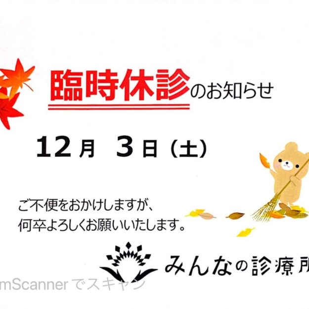 説明【臨時休診のご案内】 診療所をご利用の皆様。12月3日土曜日は原の都合により臨時休診とさせて頂きます。 皆様にはご不便をおかけしますが何卒よろしくお願い申し上げます。