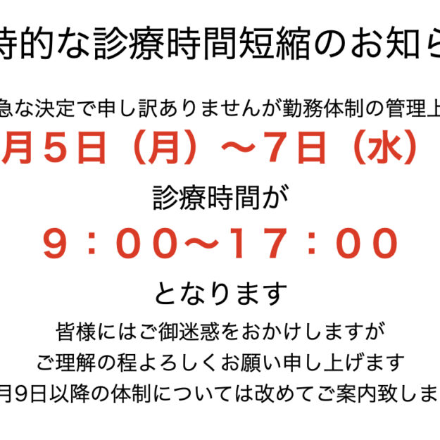 説明みんなの診療所をご利用の皆様 台風の影響で途中で感染対応を中止する日が続きご不便をおかけしております。そのような中、続けてのご連絡となり申し訳ありませんが、職員の勤務体制の管理上 9月5日(月)〜7日(水)は診療時間を9…
