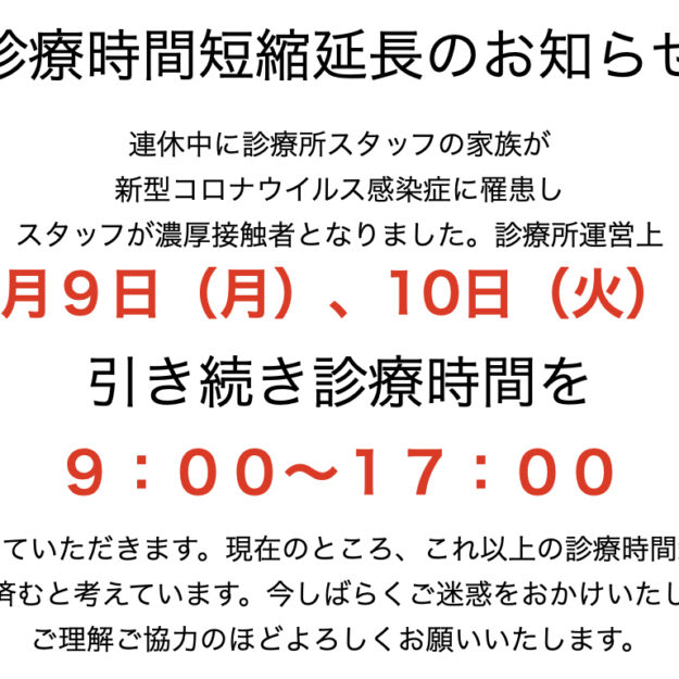 説明今年に入りに診療所が臨時的に診療時間を短縮するのは2回目となります。診療所をご利用の皆様にはご不便をおかけしますが、新型コロナウイルス感染症が10日間の療養期間を要し、濃厚接触者の自宅待機が必要な感染症である間は今後も同…