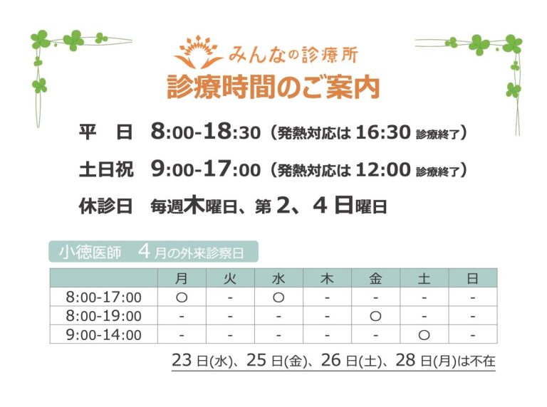 診療所の皆様にご案内です。 2025年4月から小徳羅漢医師がみんなの診療所に着任します。小徳医師はこの1年間、総合診療専門医取得のための専攻医プログラムの一環としてみんなの診療所での勤務を自ら希望し診療所に来てくれること … 続きを読む 小徳羅漢医師の診療体制について